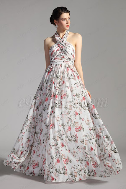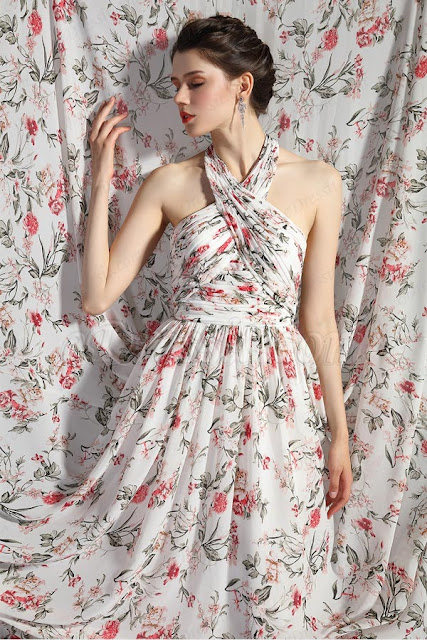 A printed dress is your summer wardrobe must-have . Check this amazing printed dress with nice fresh prints flower. You will surely fall in love it. Figure flattering cross halter neck and hand-made pleated top wrap your body perfectly. Open Back and the falling skirt shows your perfect elegance. Wear it for your fantastic summer occasions to get a unique look.