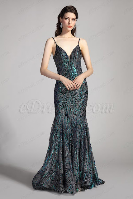 Top with sexy deep sheer V Design under the neck and the Spaghetti straps. Open Back and the mermaid skirt adds more women charming. The shinning sequins and beads fabric will sparkle throughout the night.