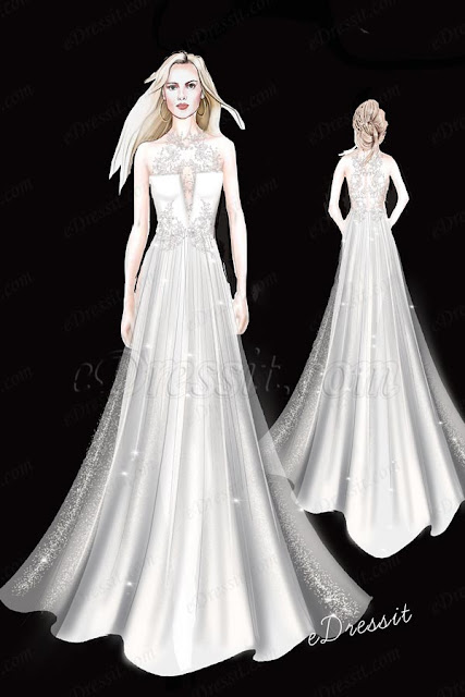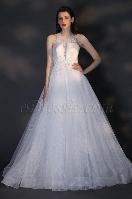 Takes your eyes on this eDressit unique Wedding dress.Stay elegant and beautiful in this stunning white Wedding dress. Graceful designs of this dress is made of high round neck and V- Design Bodice, delicate lace applique covers on top, together with the delicate beaded work. The falling tulle skirt with shiny fabric adds more feminity on the dress.It's not doubt that this gown is going to be your perfect choice for your Wedding/ Party .