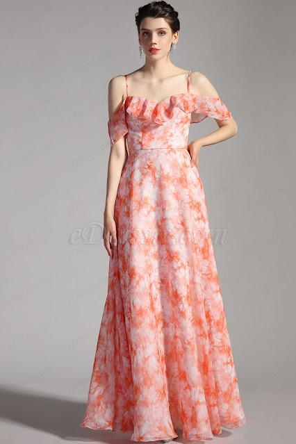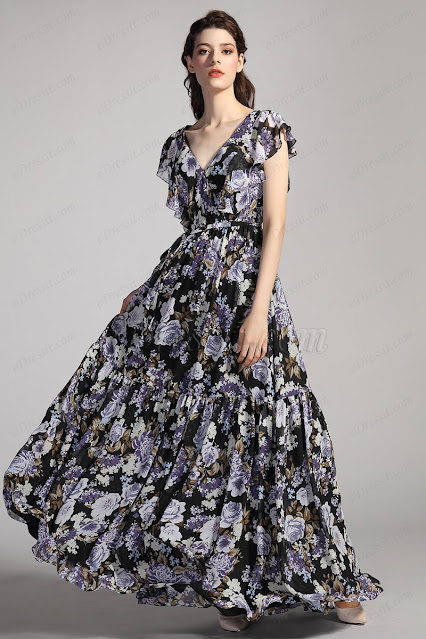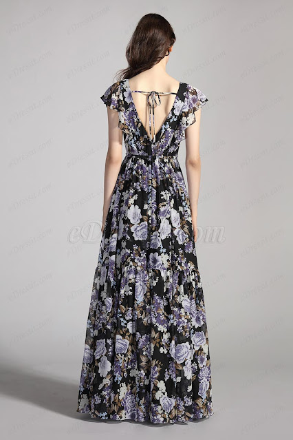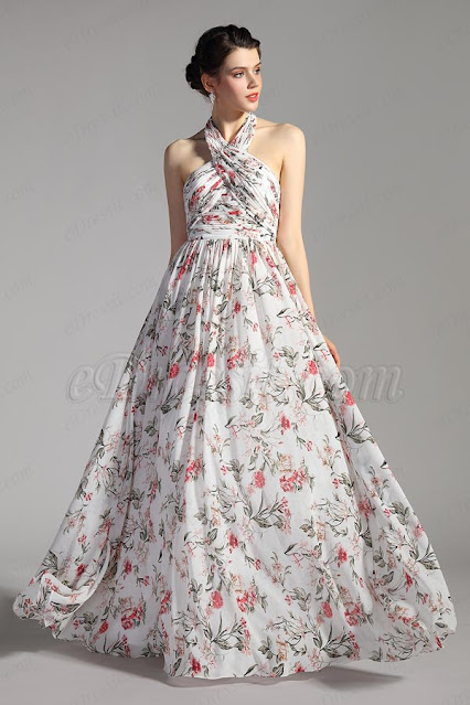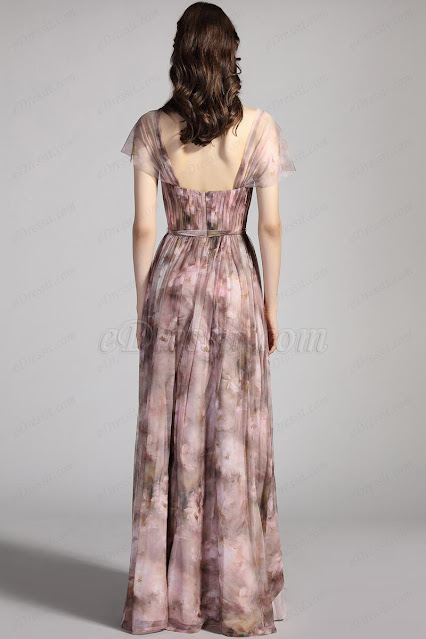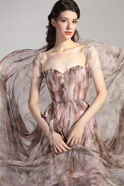 ethereal printed dress is veiled to a beautiful floor-skimming